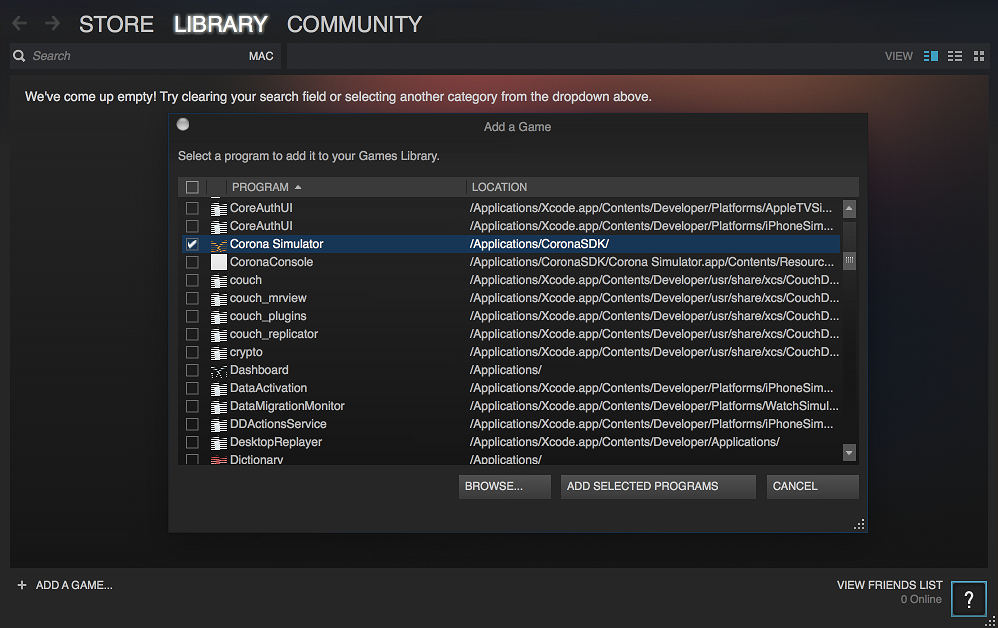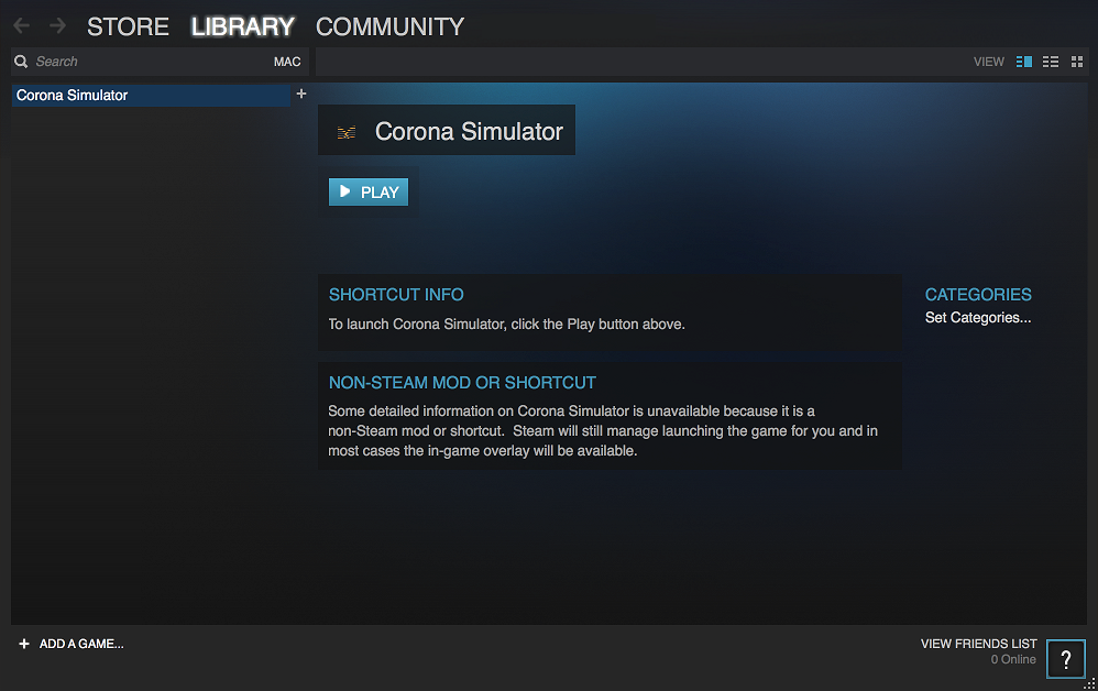 In order for developers to test Steam overlay support, the application using the Steamworks plugin must be added to the Steam client as a Non-Steam Game and then launched from the Steam client. For example, to test Steam overlay support within the Corona Simulator, the Corona Simulator application must be added and launched from the Steam client. The same must be done with Mac applications built from the Corona Simulator as well.