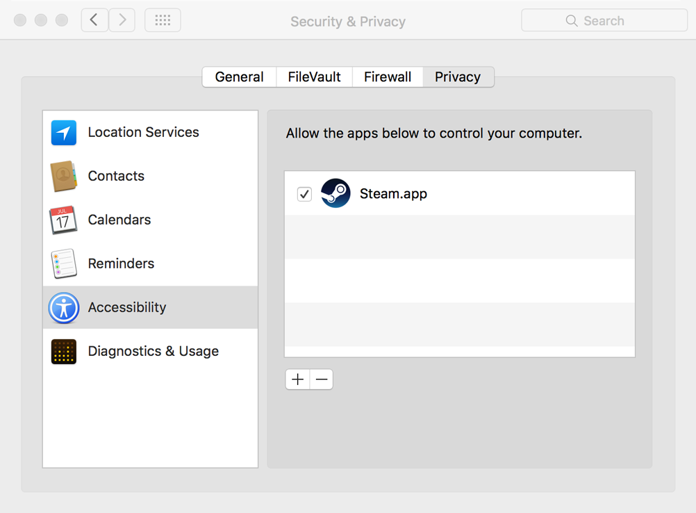 - Make sure that the Steam.app item is checked in the Accessibility list.